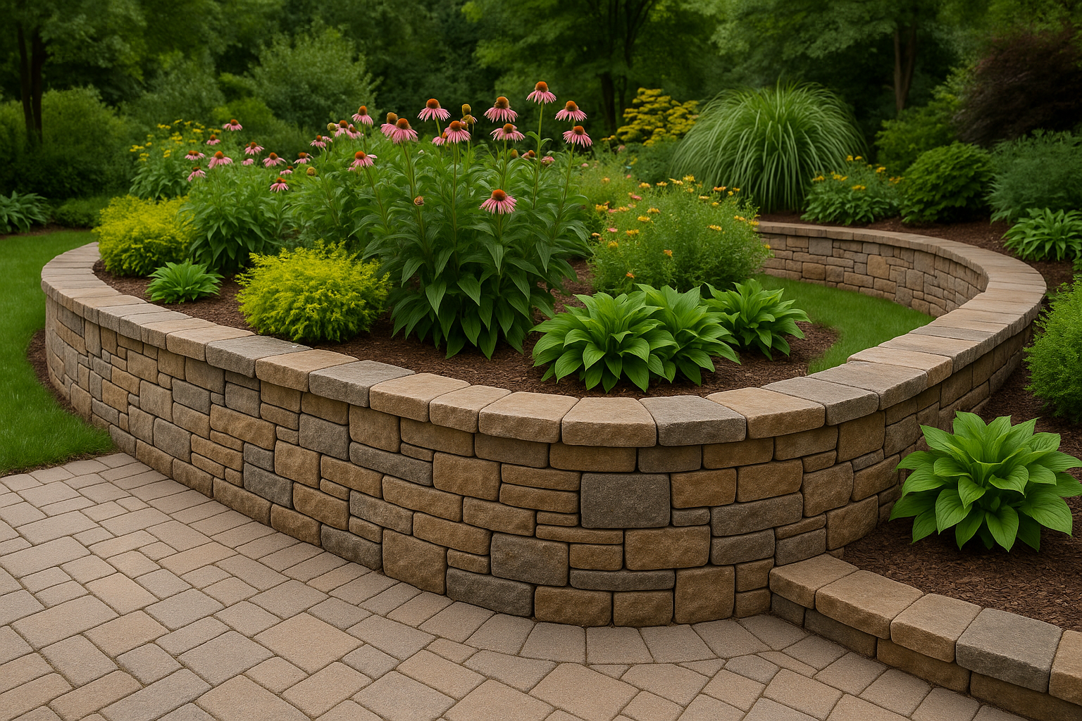 Use shallow-rooted perennials, groundcovers, and grasses on top terraces to reduce additional pressure on the wall. Trailing plants like sedum or thyme soften block or stone faces and help integrate the structure into the garden.